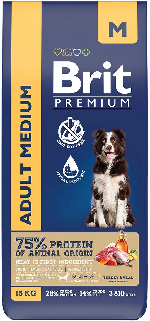Брит Premium Dog Adult Medium с индейкой и телятиной д/взр.с. средних пород (1025 кг),15 кг,5063185