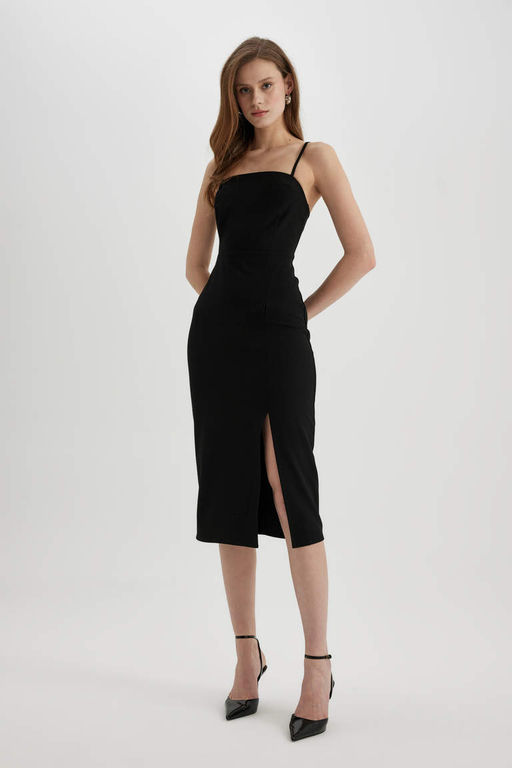 Черное платье миди с квадратным вырезом и разрезом на бретельках