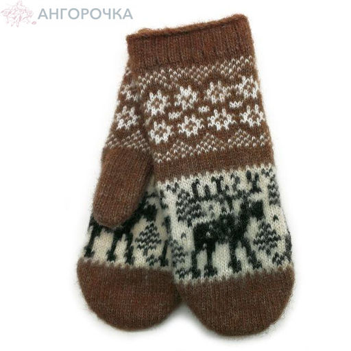 Коричневые шерстяные варежки с узором лось - 300.13