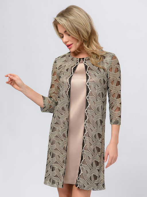 Платье бежевого цвета длины мини с золотой вышивкой и рукавами 3/4