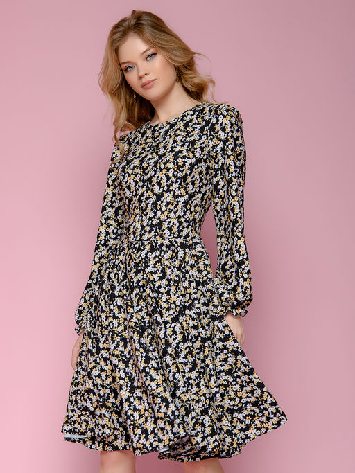 Платье черное с цветочным принтом и длинными рукавами