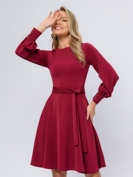 Платье вишневого цвета длины мини с объемными рукавами