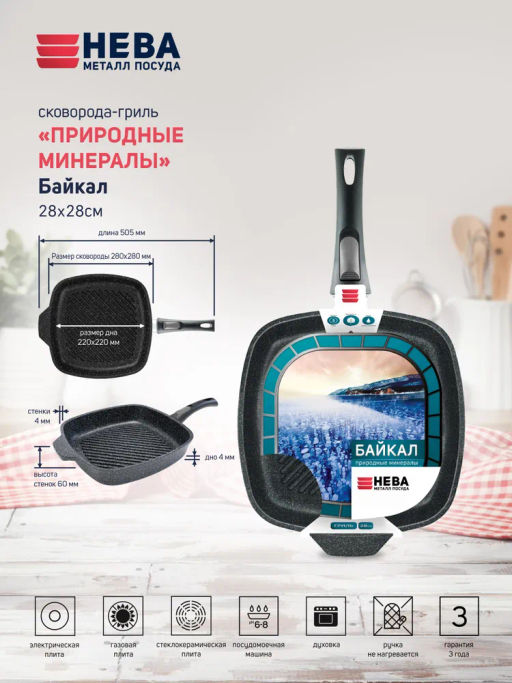 Квадратная сковорода-гриль Байкал Природные минералы, съемная ручка, 28 см