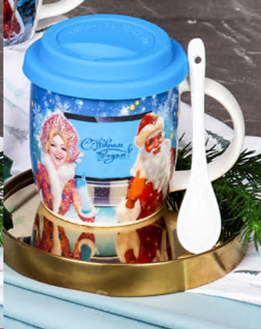 Кружка новогодняя с крышкой силиконовой,ложка /400 мл/ CE895/4 /уп 72/в коробке/ ПРОМО АКЦИЯ