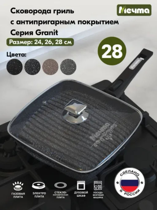 Сковорода-гриль квадр.28*28 АП Гранит star со съемной ручкой и стекл. крышкой арт.с068803 /Мечта/