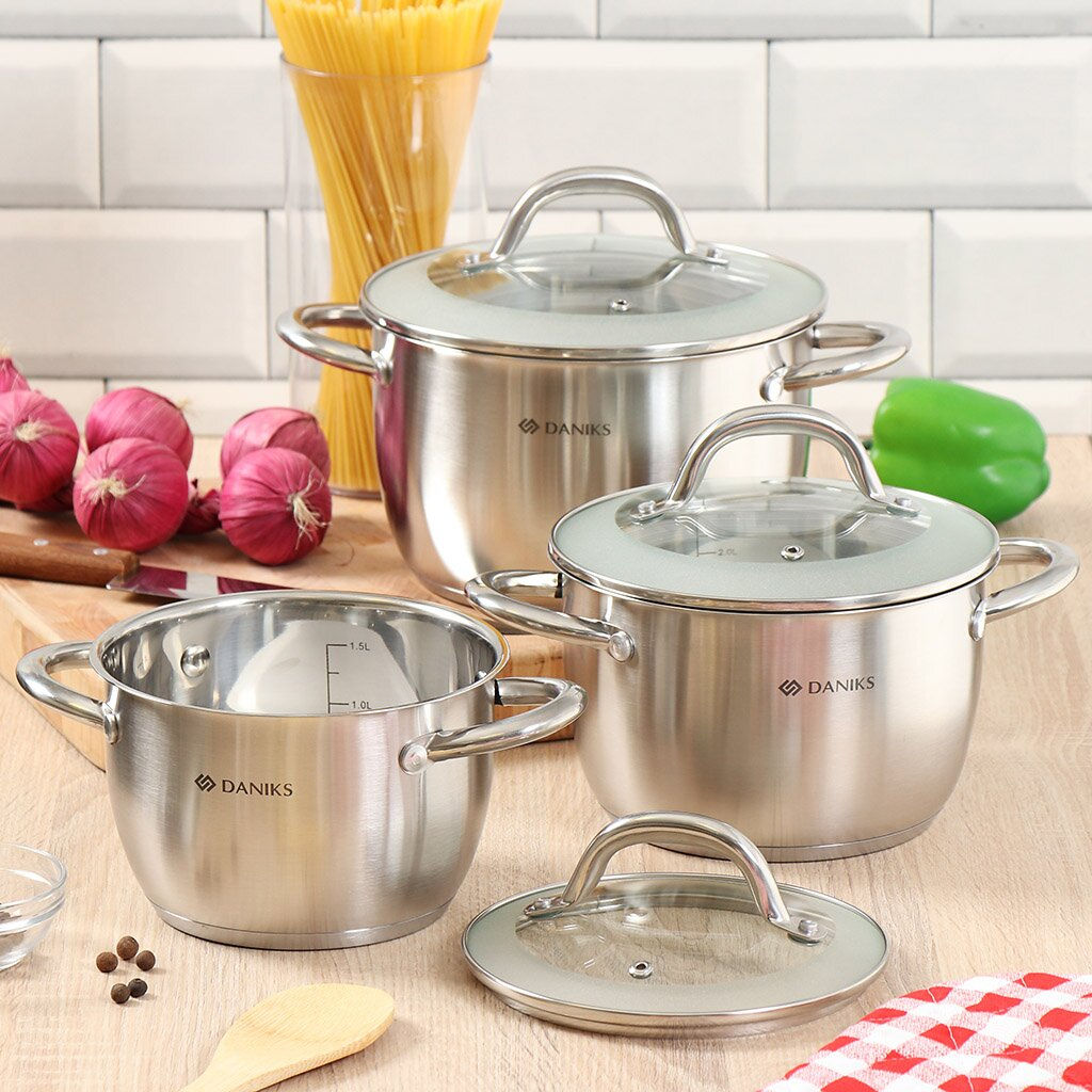 Набор посуды нерж. сталь, 6 предметов, кастрюли 1.9, 2.7, 3.7 л, индукция, Daniks, Перл, GS-01205-6