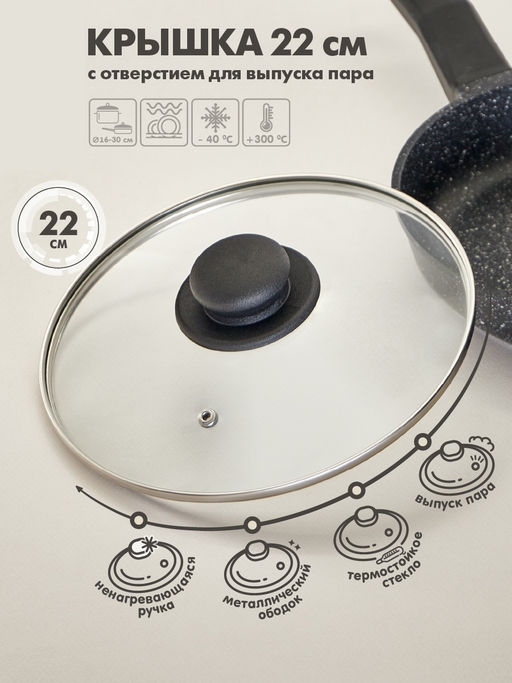Крышка с ручкой стеклянная 22см., с метал/обод, паровыпуск, низ. арт.987016