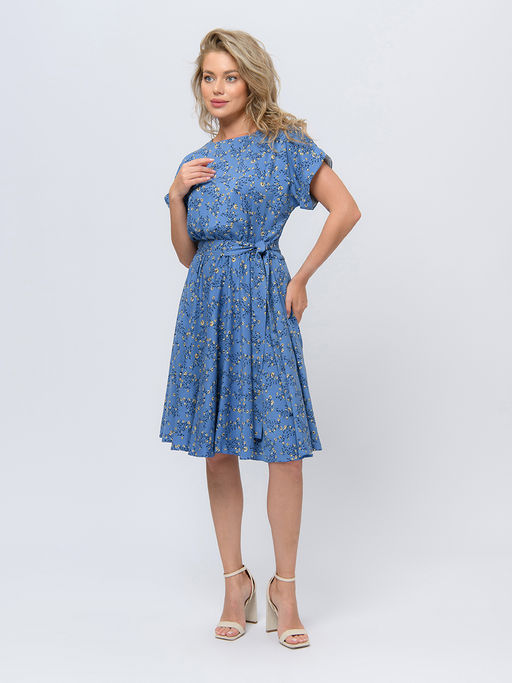 Платье синего цвета длины миди с цветочным принтом и короткими рукавами