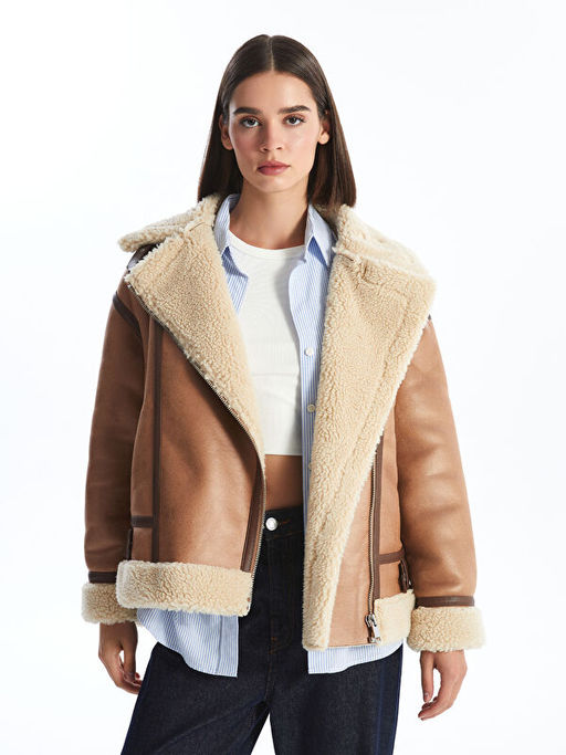 Biker Yaka D?z Oversize Kad?n Deri G?r?n?ml? Mont