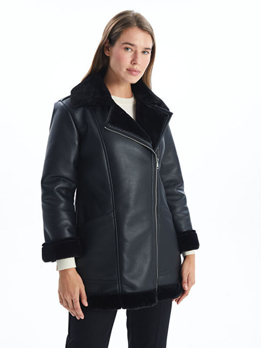 Kad?n Biker Yaka D?z Deri G?r?n?ml? Mont