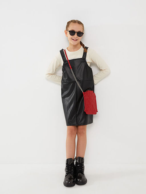 Bisiklet Yaka Bask?l? Uzun Kollu K?z ?ocuk Ti??rt ve Deri G?r?n?ml? Elbise