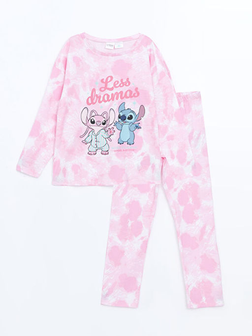 Bisiklet Yaka Lilo ve Stitch Bask?l? K?z ?ocuk Pijama Tak?m?
