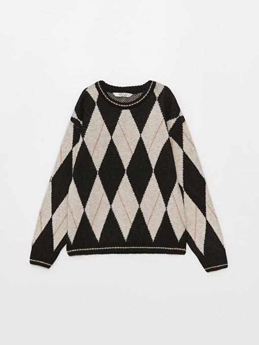 Bisiklet Yaka Desenli Uzun Kollu K?z ?ocuk Triko Kazak