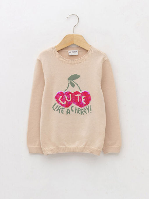 Bisiklet Yaka Desenli Pul ??lemeli Uzun Kollu K?z ?ocuk Triko Kazak