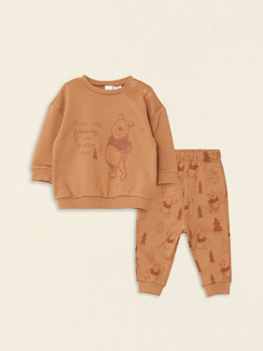 Bisiklet Yaka Uzun Kollu Winnie the Pooh Bask?l? Erkek Bebek Sweatshirt ve E?ofman Alt 2li Tak?m