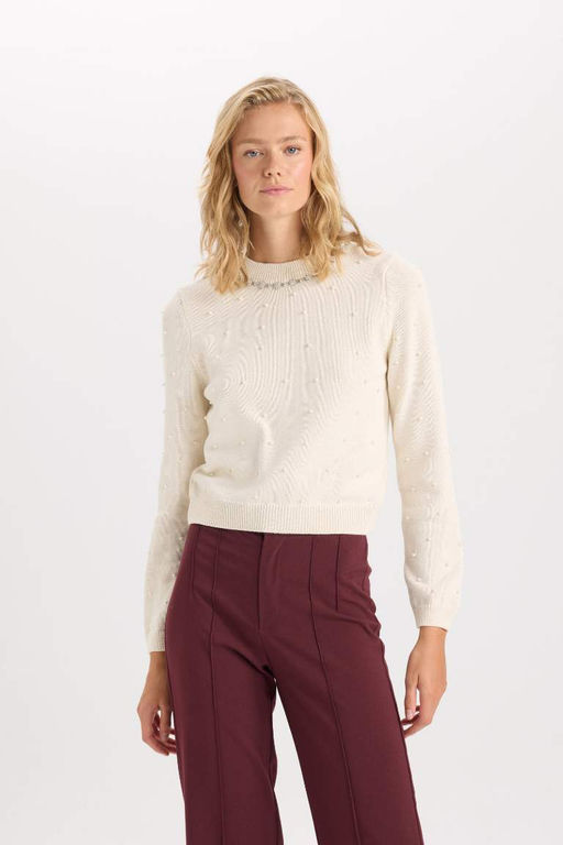 Женский трикотажный свитер обычного кроя с круглым вырезом и жемчугом