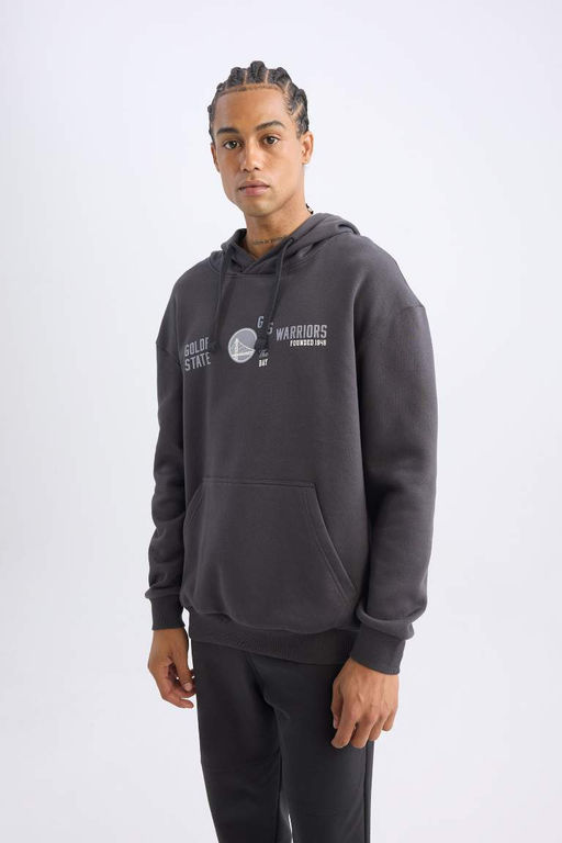 Мужской антрацитовый толстый свитшот DeFactoFit NBA Golden State Warriors свободного покроя с капюшоном и принтом