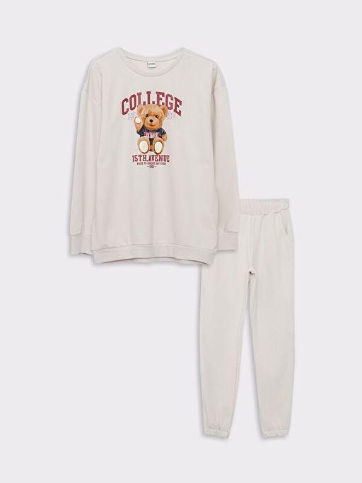 Bisiklet Yaka Bask?l? Uzun Kollu K?z ?ocuk Sweatshirt ve E?ofman Alt?