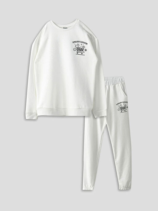 Bisiklet Yaka Bask?l? Uzun Kollu K?z ?ocuk Sweatshirt ve E?ofman Alt?