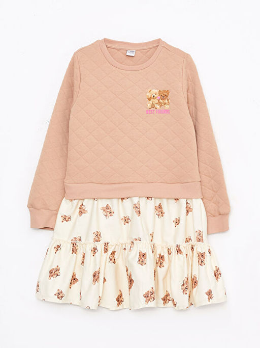 Bisiklet Yaka Bask?l? Uzun Kollu K?z ?ocuk Elbise