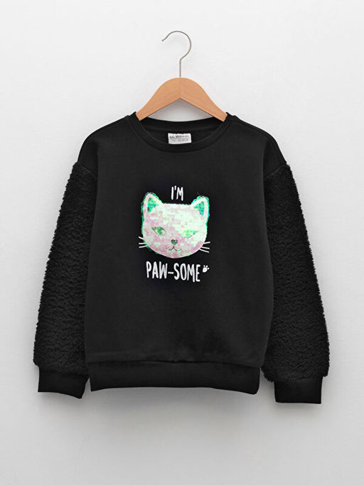 Bisiklet Yaka Pul Payetli Bask?l? Uzun Kollu K?z ?ocuk Sweatshirt