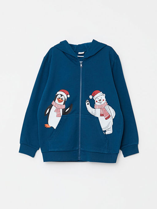 Kap??onlu Y?lba?? Temal? Uzun Kollu Erkek ?ocuk Fermuarl? Sweatshirt