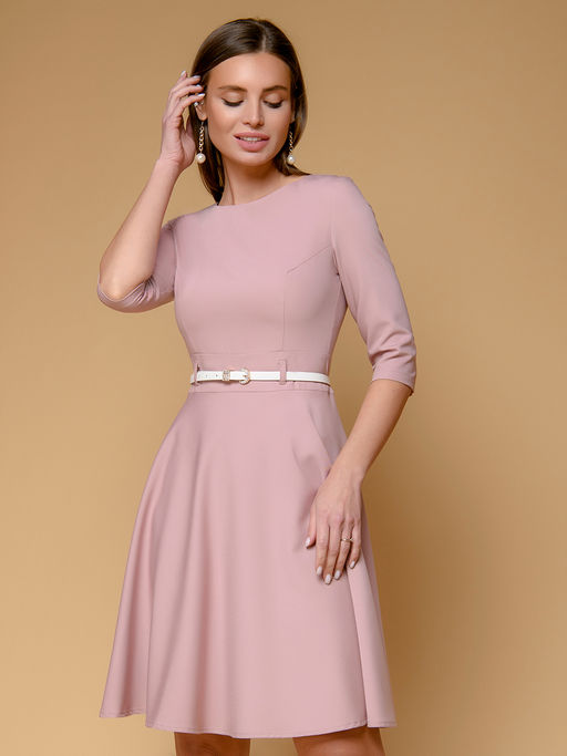 Платье розовое с рукавами 3/4 и расклешенной юбкой