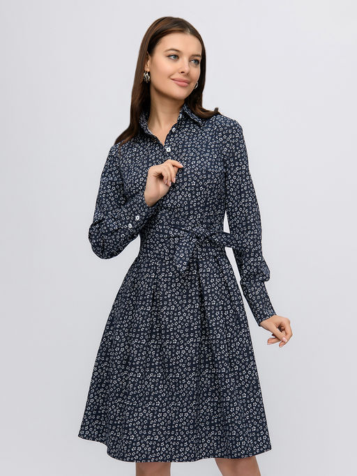Платье темно-синего цвета длины миди с принтом и отложным воротником