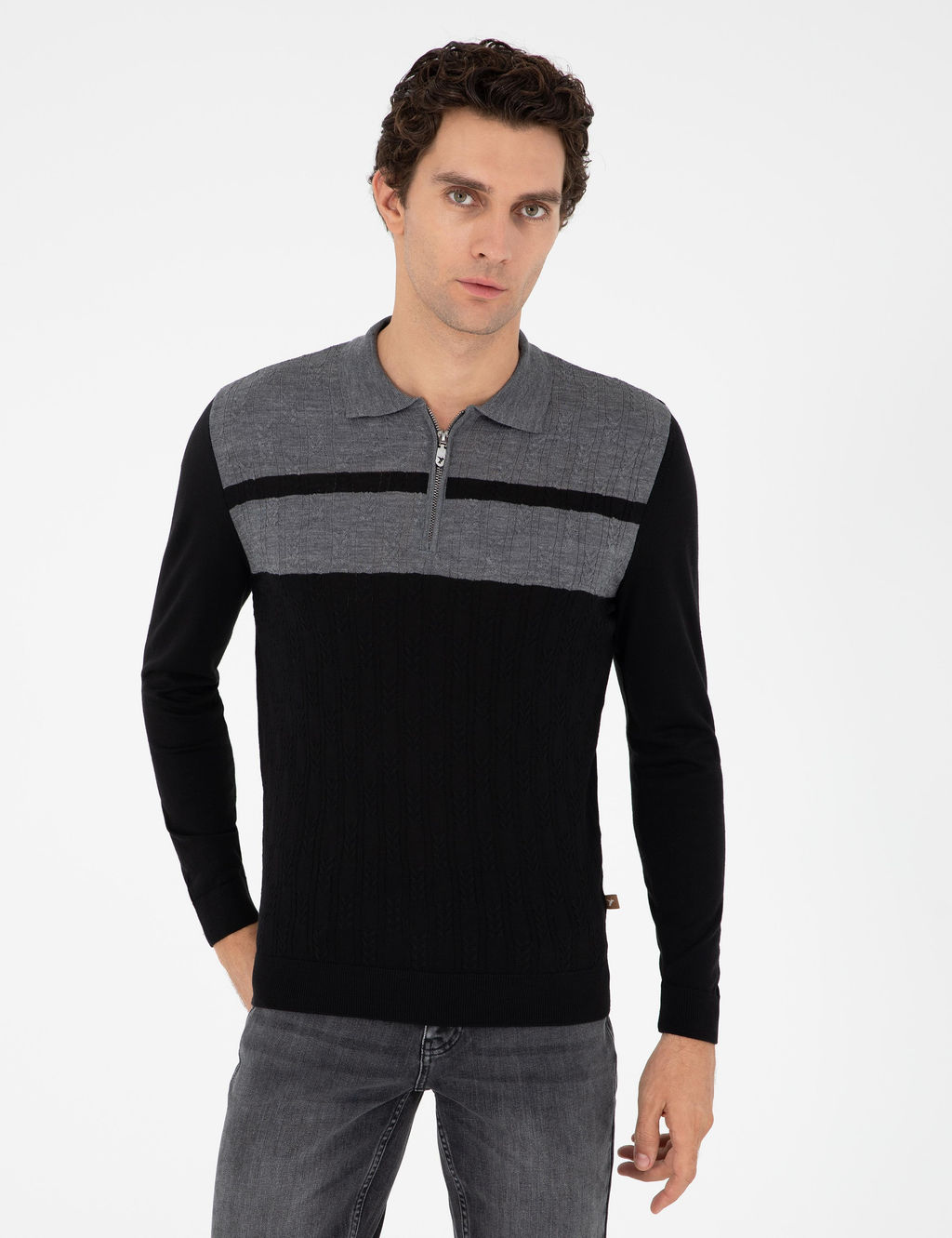 Черный трикотажный свитер приталенного кроя с воротником-поло и молнией