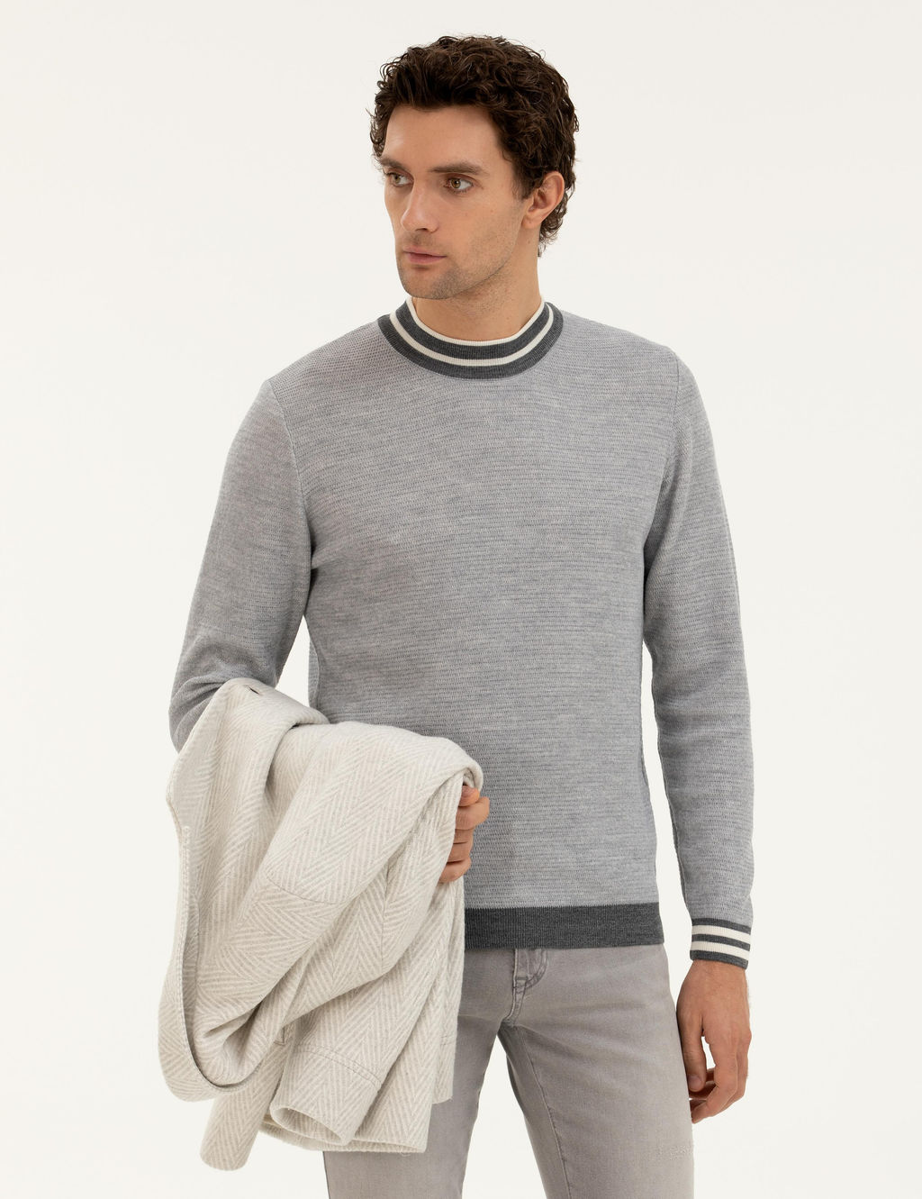 Светло-серый приталенный трикотажный свитер с круглым вырезом
