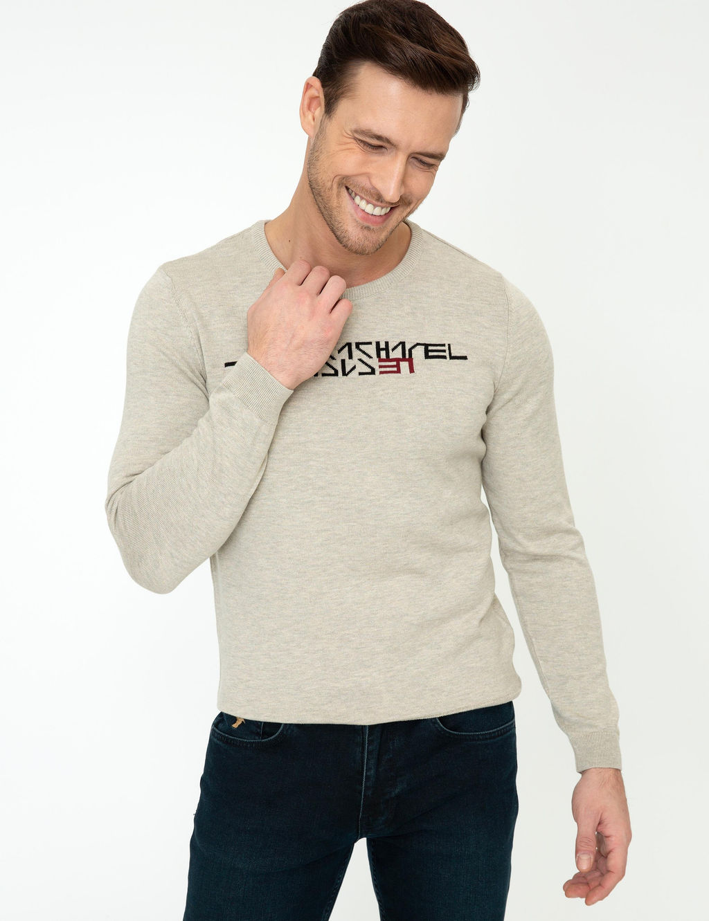 Бежевый приталенный трикотажный свитер с круглым вырезом