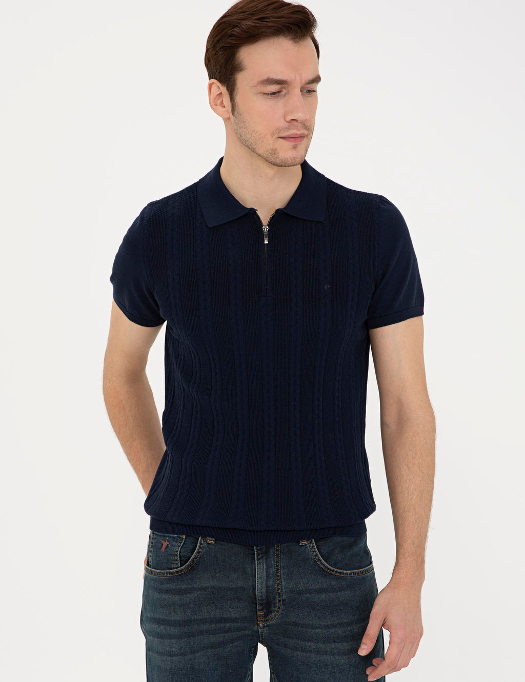 Темно-синий облегающий трикотажный свитер с воротником-поло