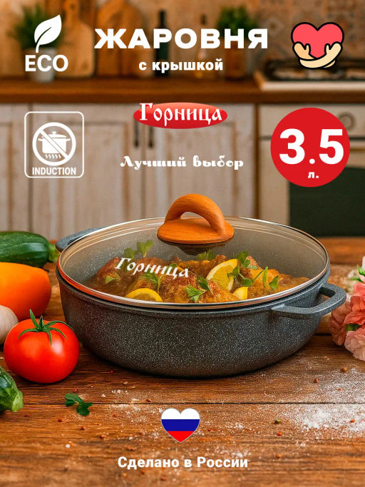 Жаровня 280/70мм 3,5л. Гармония МРАМОР лит/руч. с кр. (п/у), ж2832мр