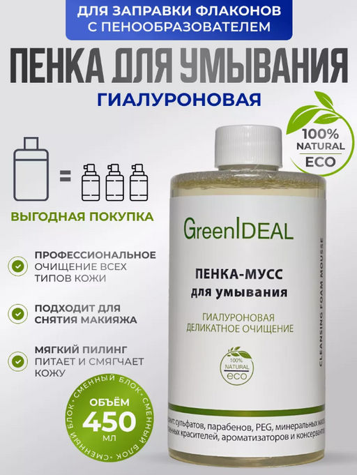 Пенка-мусс для умывания ГИАЛУРОНОВАЯ (натуральная, бессульфатная, без парабенов, без силиконов). Дополнительный сменный блок.