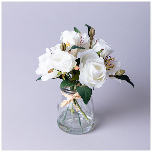 БУКЕТ ИСКУССТВЕННЫХ ЦВЕТОВ В КРУГЛОЙ ВАЗЕ ВЫСОТА= 16СМ