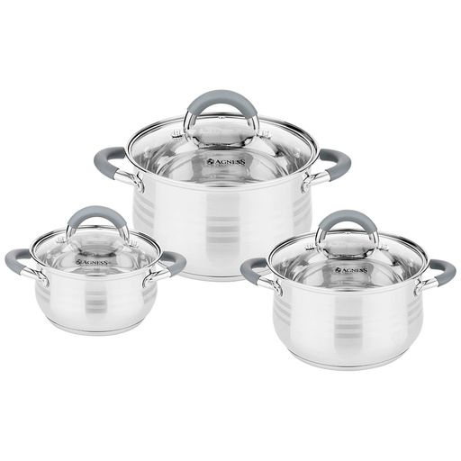 НАБОР КАСТРЮЛЬ AGNESS СО СТЕКЛ.КРЫШКАМИ 6ПР.1,7/2,6/3,5 Л. РАЗМЕР 16X9,5/18X11,5/20X12.5 СМ