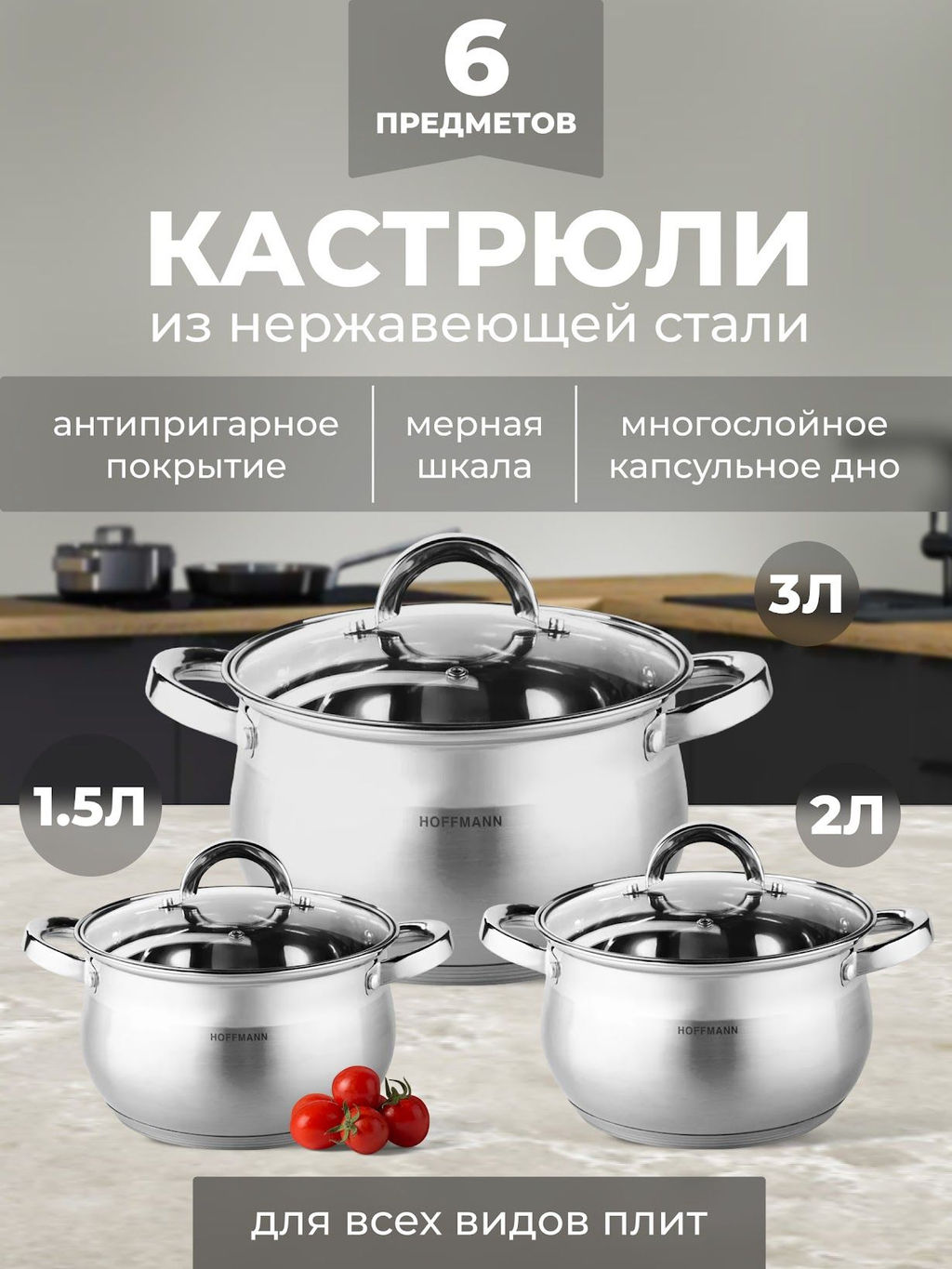 НМ 5204 набор кастрюль нержавеющая сталь капс. дно 6 предм. (кастр1,5 л; 2 л; 3л).