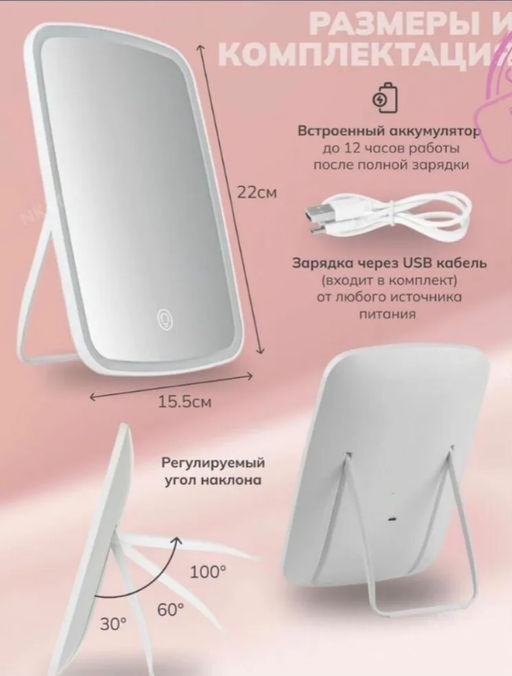 Зеркало с led подсветкой, 3 режима, гримерное для макияжа цвет розовый