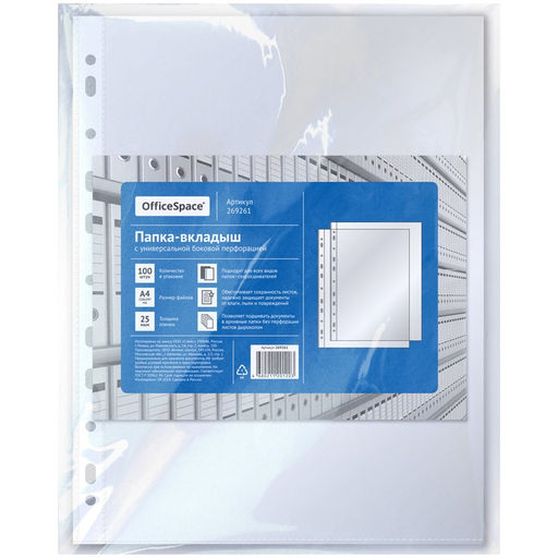 Папки перфорированные (файлы), комплект 100шт., А4, 25мкм, OfficeSpace (269261) гладкие, глянцевые