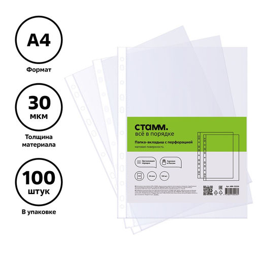 Папки перфорированные (файлы), комплект 100шт., А4, 30мкм, СТАММ (ММ-32226) матовые