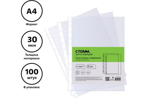 Папки перфорированные (файлы), комплект 100шт., А4, 30мкм, СТАММ (ММ-32225) гладкие, глянцевые
