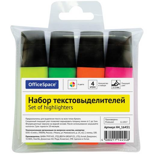 Набор текстмаркеров OfficeSpace 4шт., 1-5мм (H4_16451)