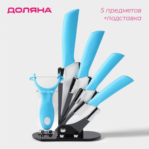 Набор кухонный на подставке Доляна, 5 предметов: ножи 7,5 см, 10,5 см, 13 см, 15 см, овощечистка, цвет голубой