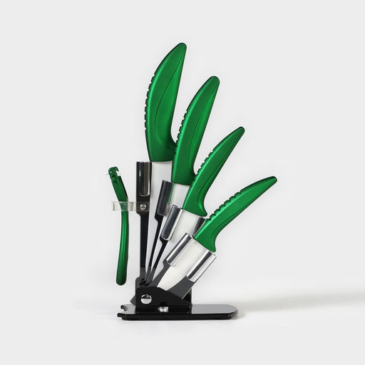 Набор кухонный Изгиб, 5 предметов: 4 ножа 7,5 см, 10 см, 13 см, 15 см, овощечистка, на подставке, цвет зелёный