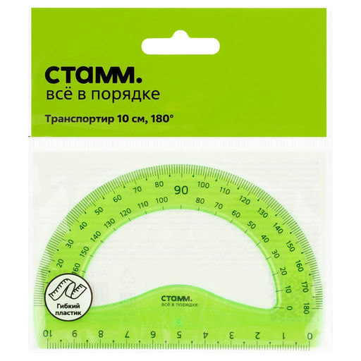 Транспортир пластиковый 10см, 180 ("СТАММ", ТР-31367) гибкий, прозрачный, зеленый