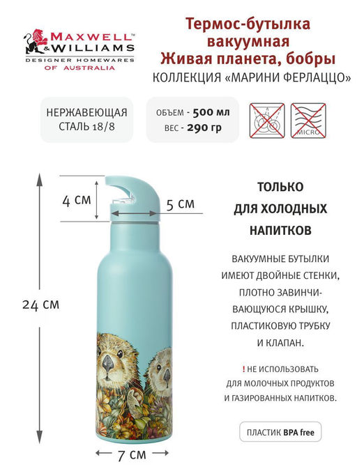 Термос, 500 мл, с трубочкой, сталь/пластик, голубой, Бобры, Marini Ferlazzo