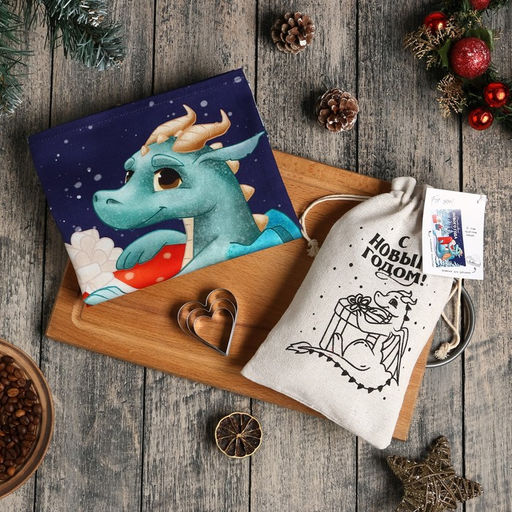 Набор в мешочке Этель "Праздничный дракон": полотенце 40х73 см, формочки для запекания - 3 ш