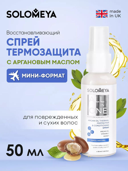 SOLOMEYA Спрей-термозащита для волос АРГАНОВОЕ МАСЛО восстанавливающий Argan Oil Thermal Protector&Conditioning Spray All in One, 50 мл