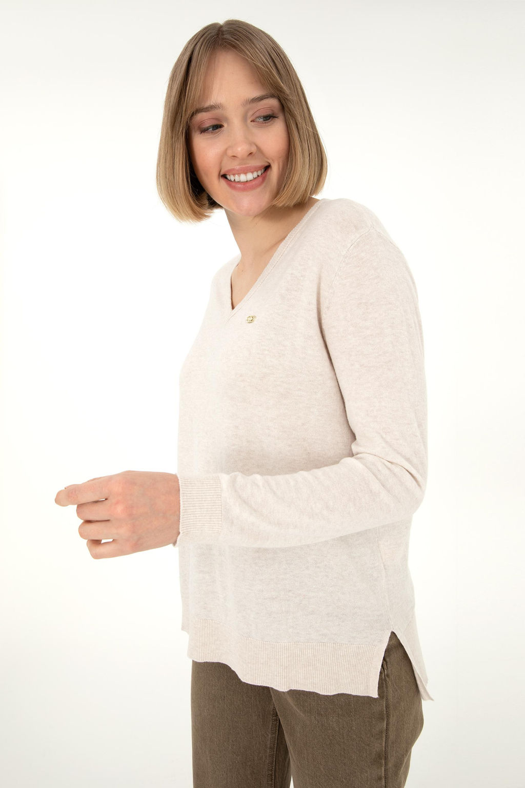 Женский кремовый меланжевый базовый свитер с v-образным вырезом Неожиданная скидка в корзине