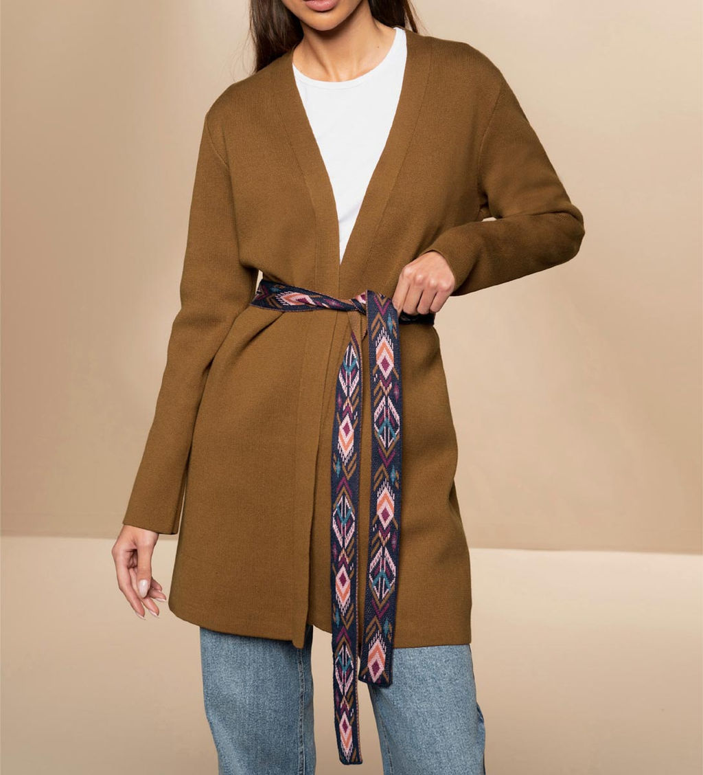 Длинный кардиган с поясом в этническом дизайне, коньячный